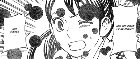 In the course of trying to persuade Mahora, Tokine’s arguments turn towards Karasumori, and her thoughts turn towards her late father. Going virtually unmentioned for 300 chapters or so, the way her emotions are shown at the bottom of page 8 is absolutely perfect. One of the ways that Kekkaishi really hooked me was its unique approach to showcasing grief; it’s never something Tanabe hits you over the head with, and it’s rarely at the forefront of anything, but that makes moments like these so greatly impactful.