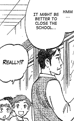 Minamoto, being still in the dark about Hyoubu’s hidden agenda, compliments him for coming just to see the kids’ play. It seems like Hyoubu is going to slip under the radar this time, which is all the more promising. That said, his reaction when he realizes he just got a compliment from Minamoto is great.