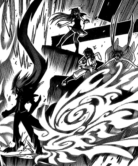 Negi is shrugging off no small number of completely devastating attacks, while tossing attacks back that match the output from Dynamis. The return of the lightning spear, but black lightning this time. Maybe Akamatsu Ken is taking some sort of signal from Kishimoto on this being the time to illustrate huge scale attacks. In defense of Negima, it has been doing this sort of thing for a long time now.
