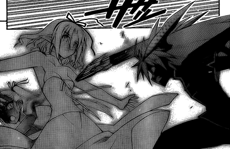 Shiori barely escaped the fatal blow, and Negi has ceased his advance into being a creature of darkness. I don’t know how I feel about the former. A straight-out death isn’t something expected in Negima, but it might not have been a terrible development. Negi is rendered useless for the foreseeable future; he’s a shell of his former self.