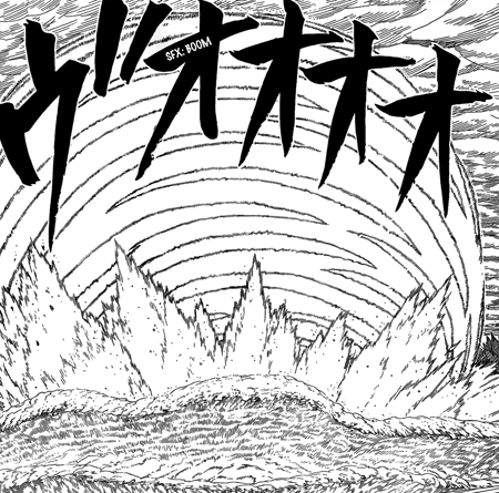 Kishimoto has fallen in love with grand-scale attacks and artwork. The scene with the giant turtle being capsized would make for excellent animation, too.