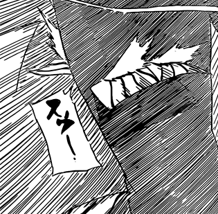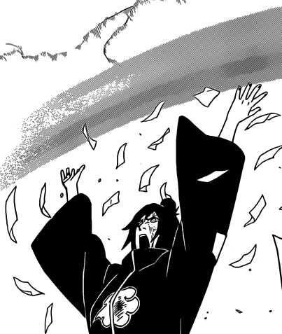 Yet another excellent large-scale attack, as Konan swallows up Madara within an ocean of paper. Great artwork by Kishimoto.