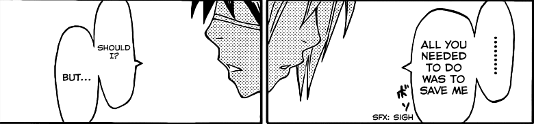 On the positive side, this chapter has provided some overall storyline progression: Niko’s trust in Utsuru continues to grow, as evidenced by her accusal of her former teacher based solely on Utsuru’s claim. I particularly liked the following combination of panels, even without backgrounds, as they conveyed that sense well.