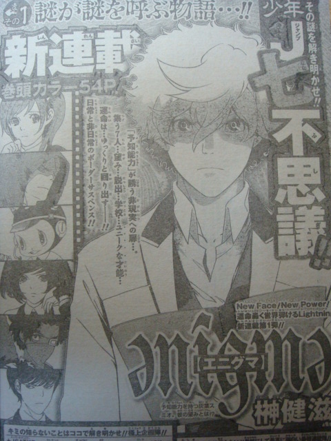 The space left by Shonen Shikku will be filled starting next week by Enigma, a new series by Sakaki Kenji, a former assistant to Amano Akira (Katekyo Hitman Reborn!). An early preview picture is available: