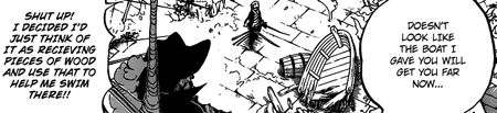 Zoro is asking Mihawk to teach him? “Asking” might not be strong enough, even; Zoro is “begging” Mihawk, the man he intends to defeat, to teach him. I’m thoroughly disappointed. Yes, it shows that Zoro is mature enough to put aside his own ego for the sake of his crew, but what now of his fierce ambition to become the world’s greatest swordsman? Zoro has always shown maturity when necessary (such as his stance on Usopp as they arrived at Water 7), so this doesn’t introduce any new positive side of his personality, but instead waters down his character.
