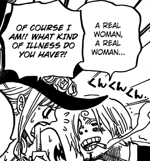 So much for Sanji having a scar or facial deformity or any kind of unique feature on his left eye. Oda’s nonchalance in switching Sanji’s hair parting is the perfect kind of character redesign. Also, I’m glad Sanji’s taste for women hasn’t changed.