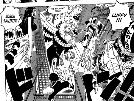 Finally. For the first time since chapter 512, released September 1, 2008, the entire crew is together. Despite some truly excellent storytelling throughout the War arc, it’s been an agonizing wait. I still don’t feel like the weight has been fully lifted, because of some of the outlandish crew redesigns, but complaints aside, seeing everyone reunited is a major relief.