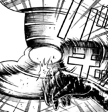 Last chapter, we were left waiting with baited breath to find out the nature of Matsurigi’s “cubic subtraction” ability. This chapter wastes no time with the reveal: Matsurigi can shrink (and otherwise modify) objects. The ability does fit the name, but I’m not sure how a miniaturized flagpole will solve our current predicament.