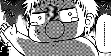 Miki is being unbelievably suggestive in his awkward approaches to Oga. Fortunately, Baby Beel has an appropriate reaction and facial expression for this, as well.
