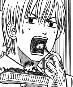 Furuichi watching the upcoming fight while eating serves no particular purpose other than being funny. Still, it accomplishes that well.