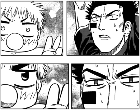 A traditional Oga ego-crushing retort (complete with priceless Baby Beel facial expression), and the chapter is over. Oga’s derisive attitude towards Kiriya is amusing, but I’m not entirely sure how well it will work with the serious undertones of this arc, given the legitimate tension between the Horsemen and the Ishiyama students. These are both plot lines that I want to see resolved properly, but I’m not convinced that can happen simultaneously.