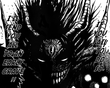 Judging from the following panels, it seems that Oga did not actually fully transform, but instead projected a horrifying vision to Kiriya. That said, what a fantastic scene.